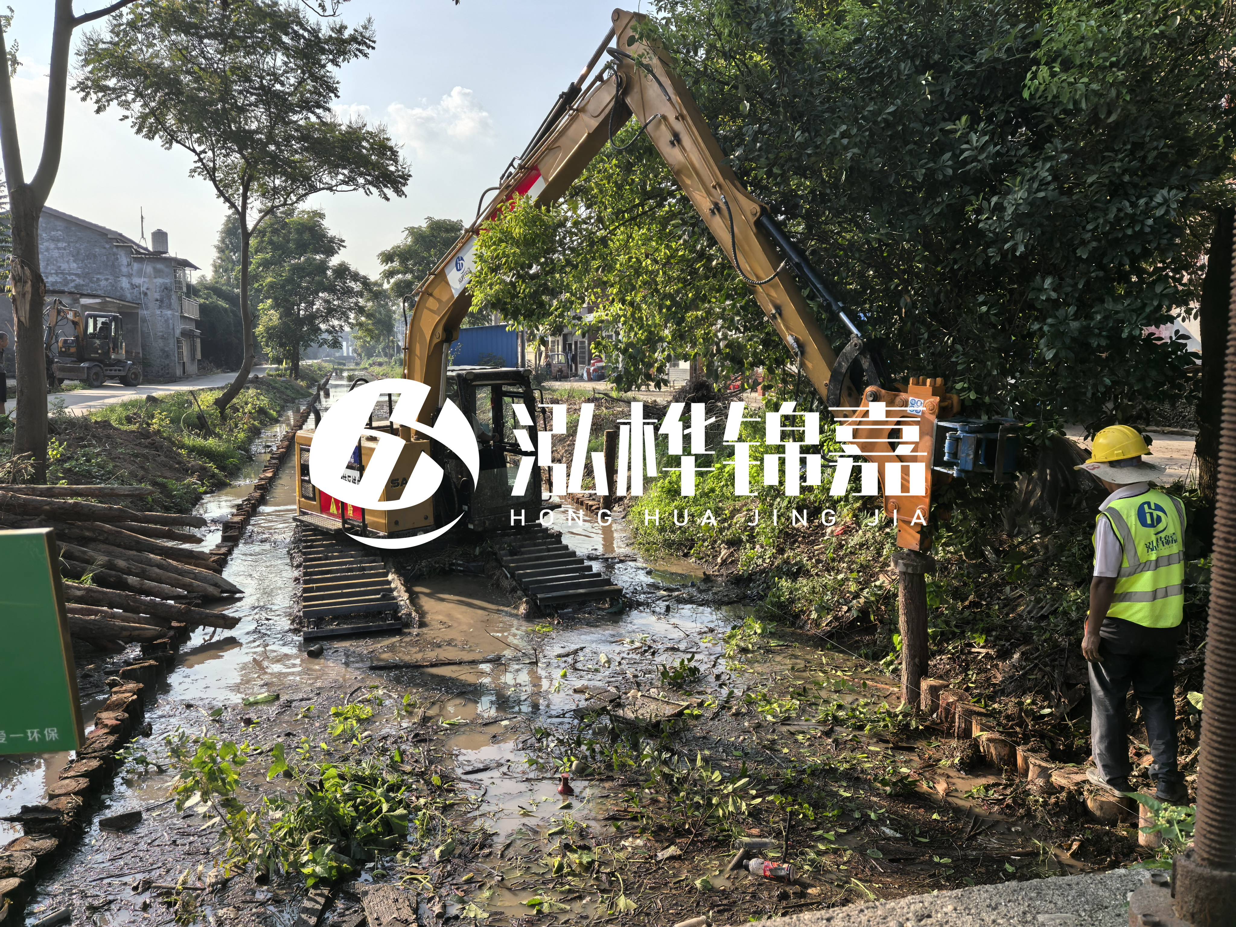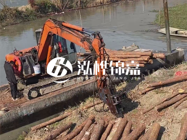 水挖(也就是水上挖掘機(jī))的液壓錘功率直接決定能打多長的樁。普通 60 型水上挖掘機(jī),液壓錘沖擊力有限,最多打到 5 米就很吃力了 —— 就像人用小錘子敲長釘子,容易把釘子敲彎。而大型 200 型以上的水挖,液壓系統(tǒng)能提供足夠的沖擊力和穩(wěn)定性,才能駕馭 8 米以上的長木樁。泓樺錦嘉能打 8 米木樁,首先靠的就是設(shè)備優(yōu)勢。他們用的是定制款水上挖掘機(jī),液壓錘經(jīng)過改裝,沖擊力比常規(guī)設(shè)備提升 30%,而且機(jī)身配重更合理,在水面作業(yè)時(shí)減少晃動(dòng),避免長木樁因受力不均斷裂。